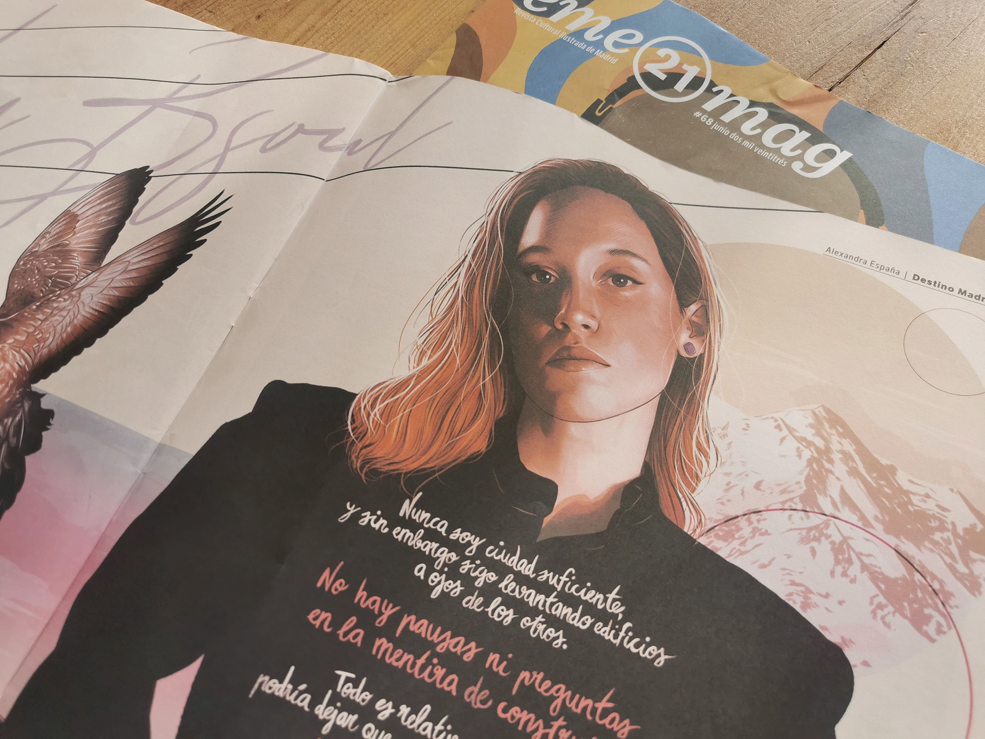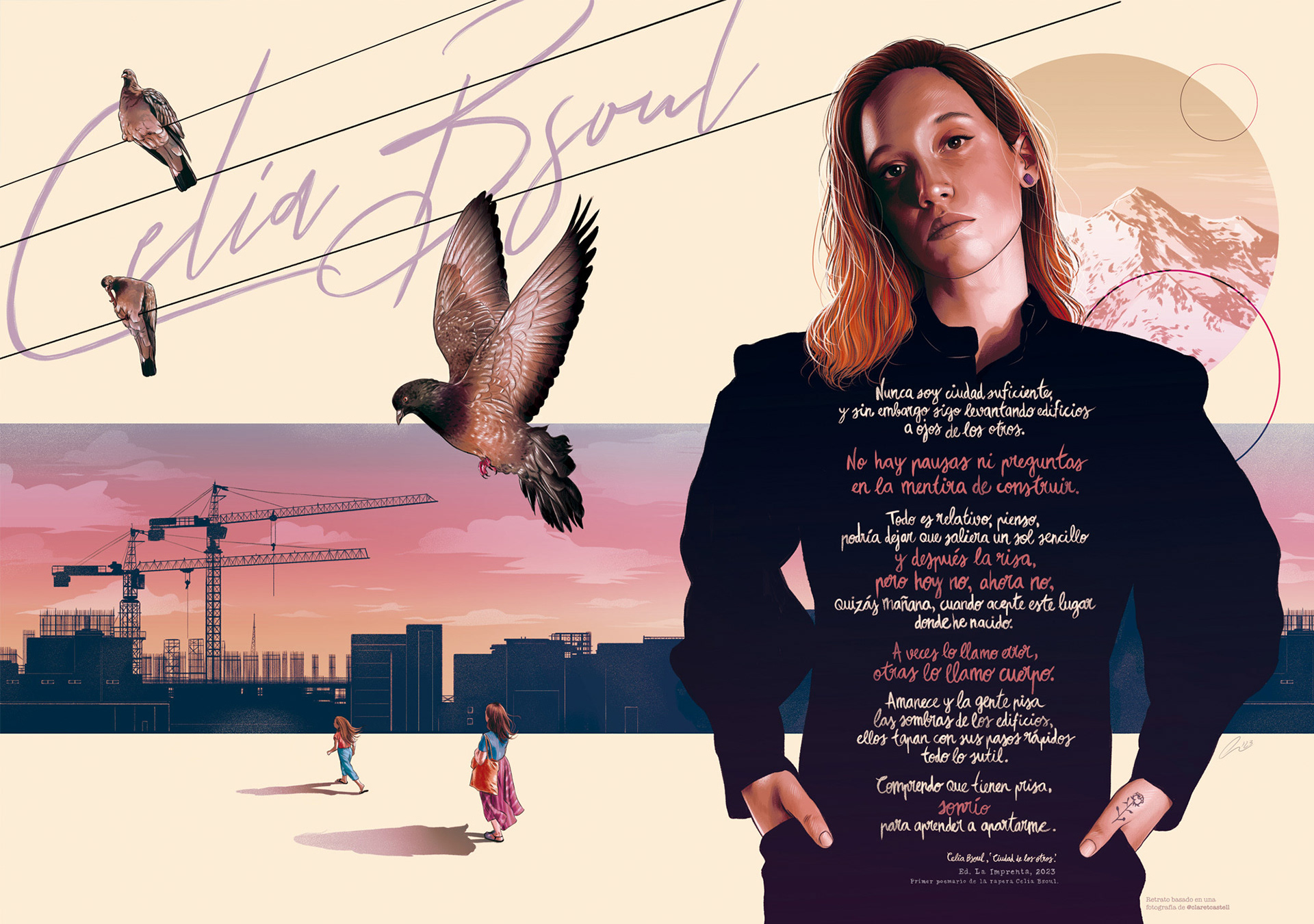 Illustration of one of the poems from the book ‘Ciudad de los otros’ (City of the others), the first collection of poems by the Spanish rapper Celia Bsoul. Published in the cultural magazine Eme21.
