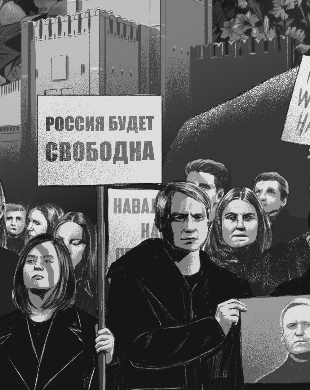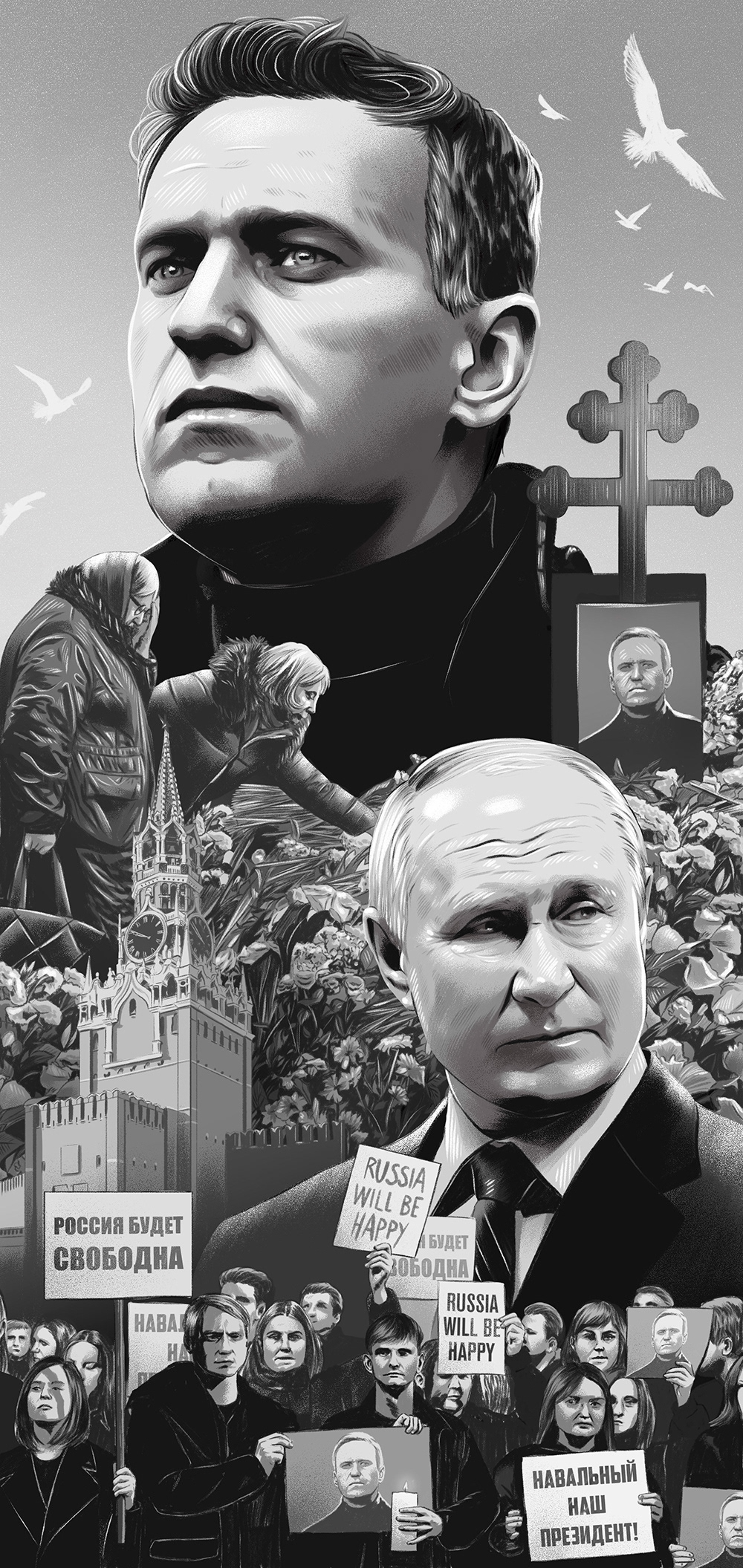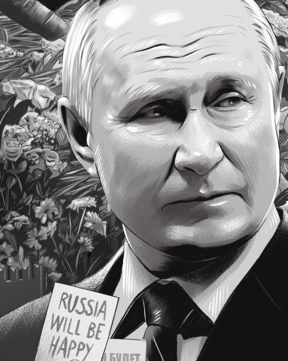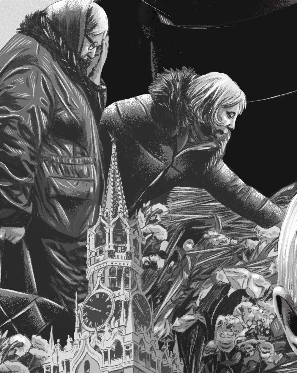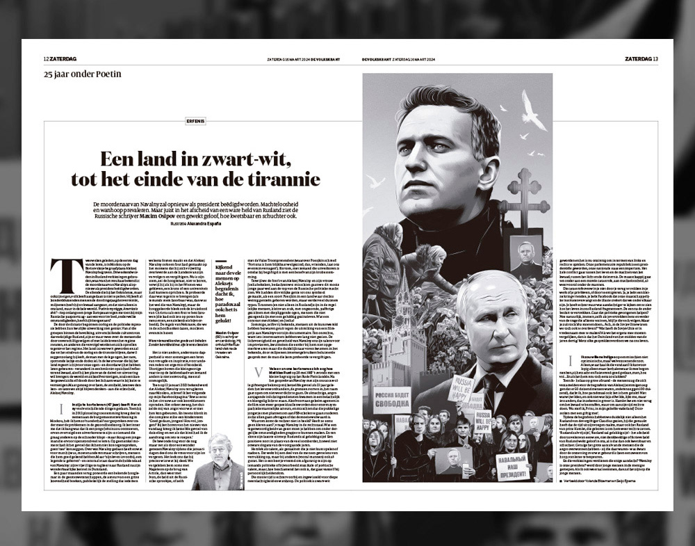 Illustration published in the Volkskrant newspaper on the reactions to the death of Alekséi Navalni.
